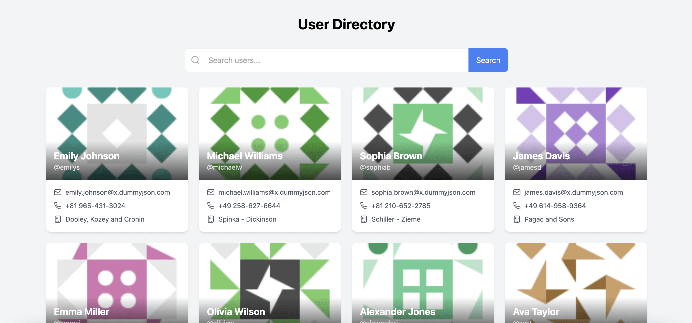 "build me a user list application, which fetches user list from my api (/users endpoint), and can search users (server side search, use the /search api), open profile of a single user (use /users/:id endpoint)"