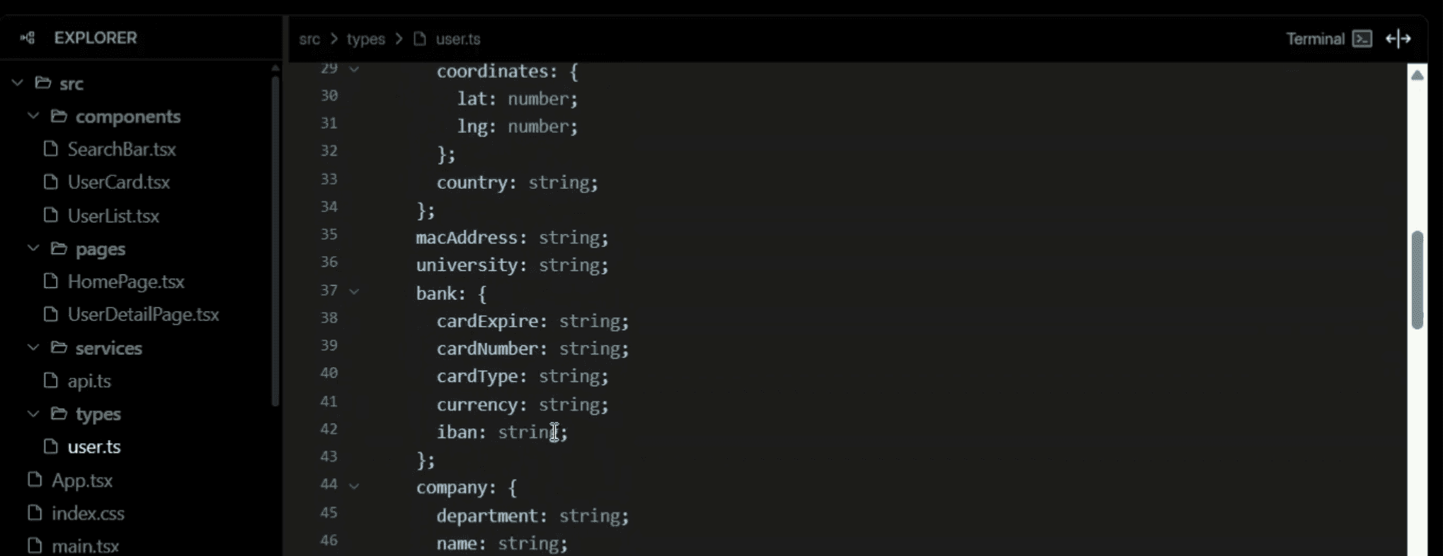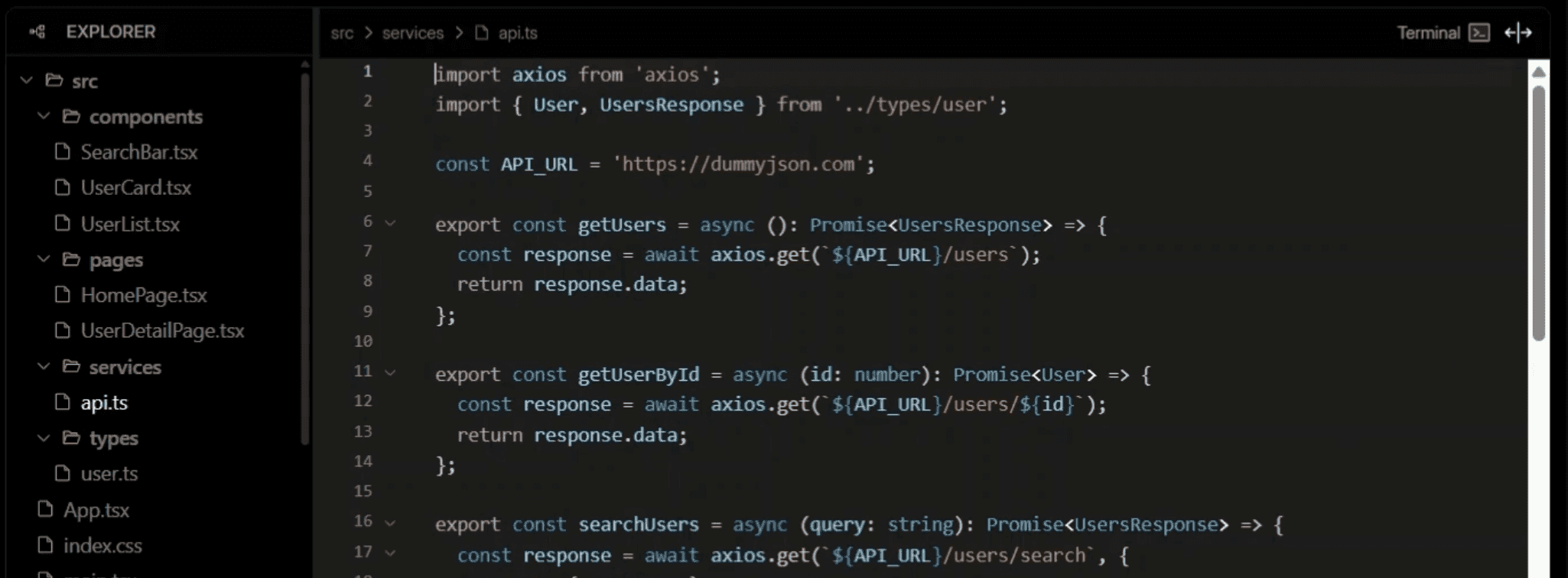 As it loads, you can see it has created separate functions under api.ts and has created separate SearchBar.tsx, UserCard.tsx, and UserList.tsx based reusable components and two pages: HomePage.tsx and UserDetailPage.tsx