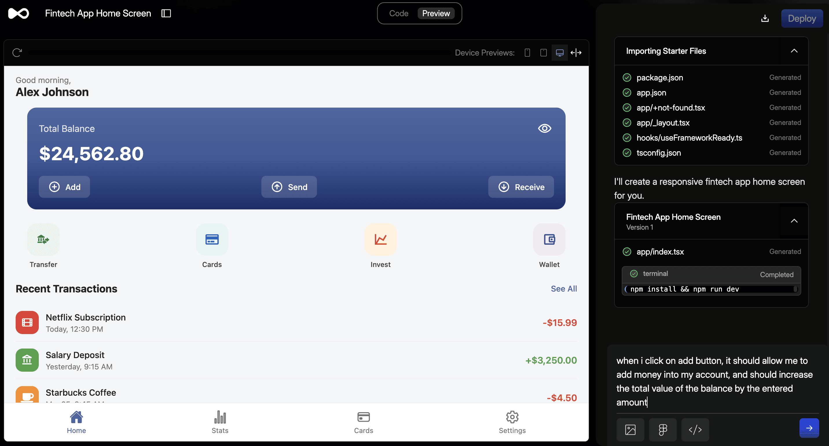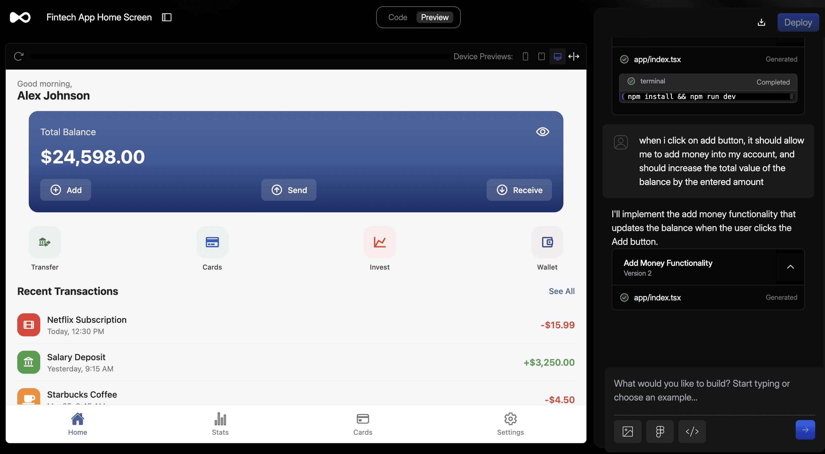 “Build me a responsive FinTech app home screen.”