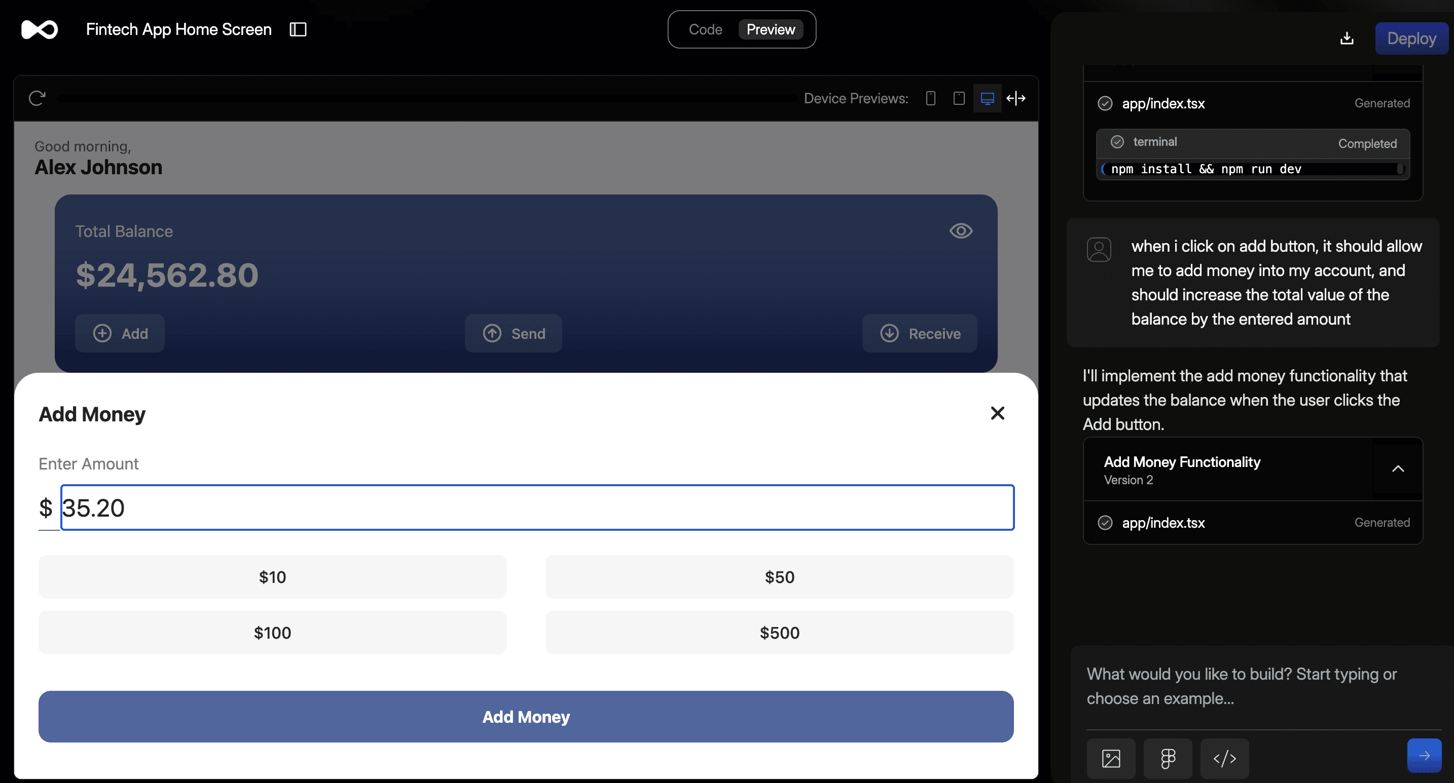 Suppose the user wants to add funds to their account: clicking the “Add” button should prompt them to enter a deposit amount, which is then added to update their total account balance accordingly. So, I’ll write a simple prompt explaining my need and Dualite will edit the app accordingly and deliver you the desired functionality.