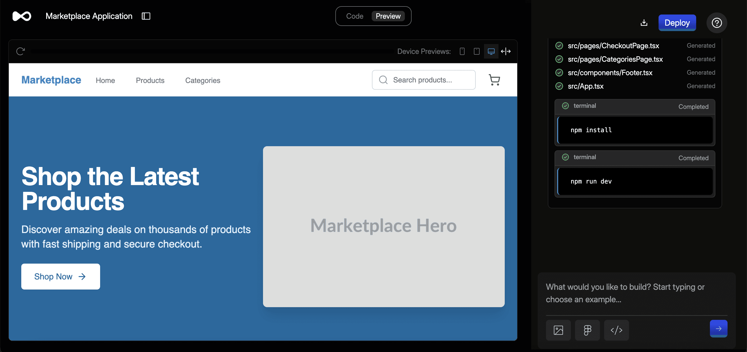 For our case, you simply can type "Generate me a marketplace for multiple listings, product details, checkout and payment pages" and click on Enter