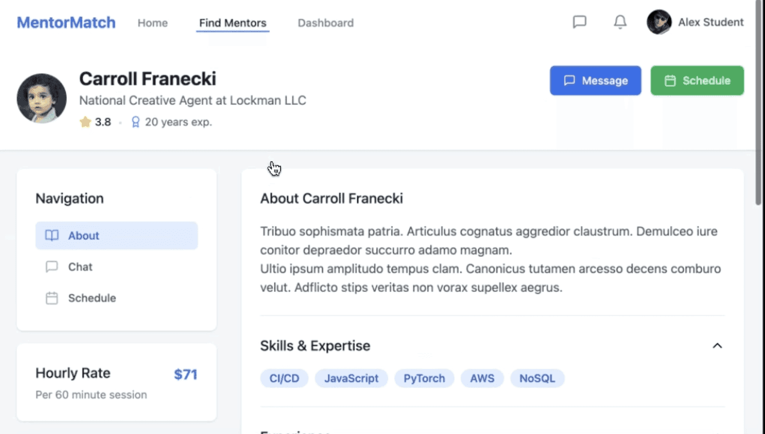 Build me a mentorship-based platform for engineering students, specifically to find mentors, talk to them, and book a meeting.