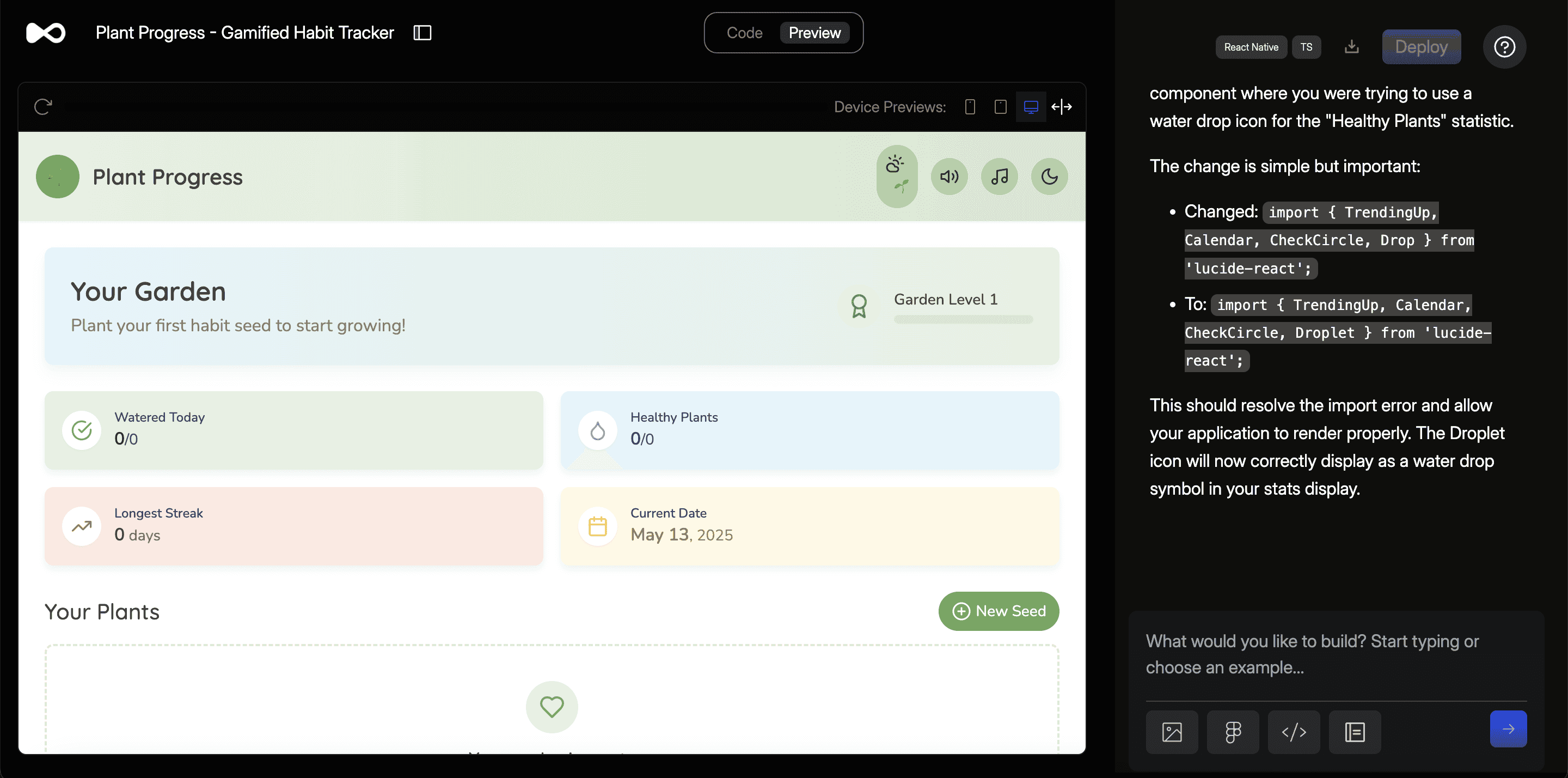 Dualite is an AI app builder that lets you create a fully functional, gamified habit tracker app without writing a single line of code. Describe your idea : a plant-growing productivity app where every completed task sprouts a virtual plant : pick the React + Tailwind framework, and Dualite generates a live, animated app with smooth GSAP animations, daily streaks, and a personal habit garden : in under an hour. Your final code is real, deployable, and yours to download anytime.
