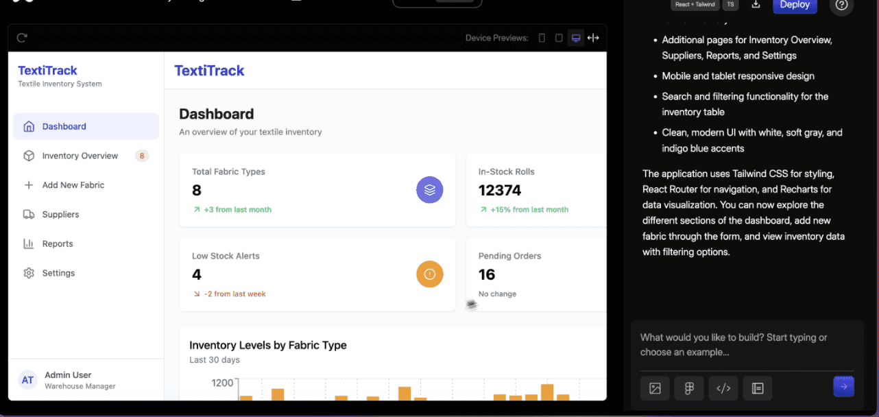 Dualite is an AI app builder that lets you create a fully responsive textile inventory management dashboard without writing a single line of code. Describe your warehouse needs in plain English, pick the React + Tailwind framework, and Dualite generates a live, branded dashboard : with fabric tracking, low stock alerts, supplier views, and inventory analytics : in under an hour. Your final code is real, deployable, and yours to download anytime.