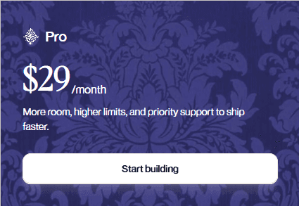 Pro : $29 per month. Includes 200 messages, priority email and Discord support with 2-hour response time, and enhanced GitHub import limits.