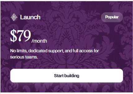 Launch : $79 per month. Includes unlimited messages, all Pro features, and dedicated 1-to-1 support with a product expert. Most popular for teams shipping real products.