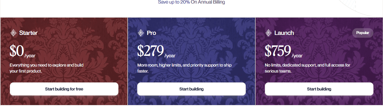 Annual billing is the better option if you are committed to building — you save $69 on Pro and $189 on Launch compared to paying month by month.