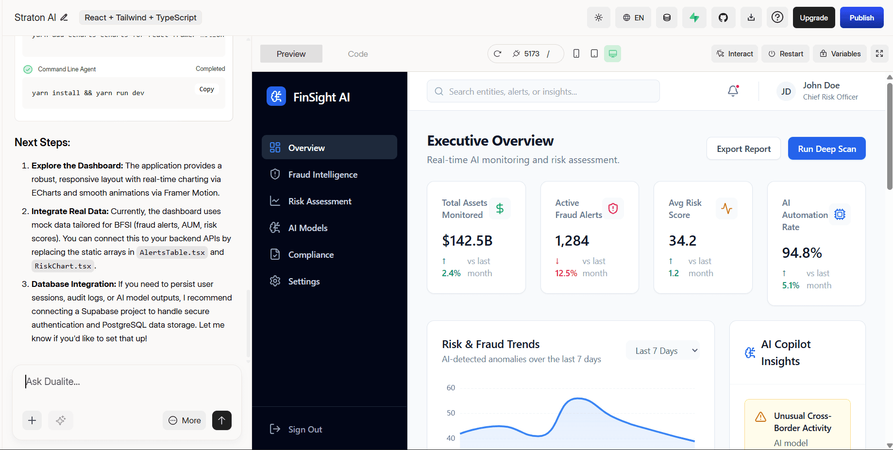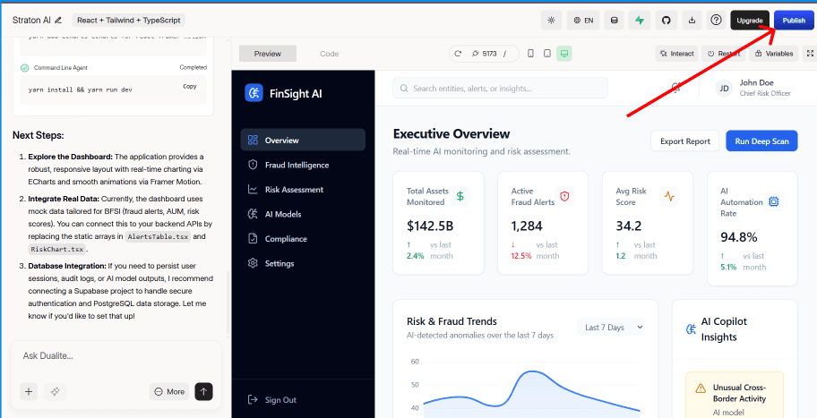 When your app is ready, click the Publish button in the top right corner. Dualite connects to Netlify its deployment partner and publishes your project live with a single click. No DevOps knowledge required. You get a live URL immediately, globally distributed and ready for real users from day one. If you prefer to handle deployment yourself, click the download icon next to the Publish button to download your complete codebase as a ZIP file.