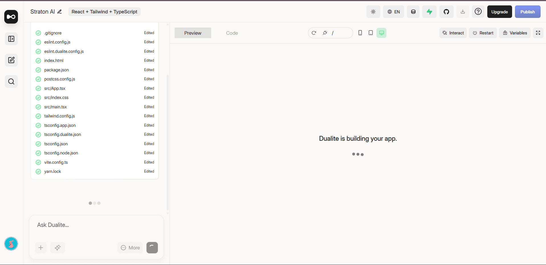 Once you submit your prompt, Dualite gets to work. It typically takes one to two minutes to generate your application. You do not need to do anything during this time Dualite is writing all the code, setting up the file structure, and preparing a live preview. When it is done, the preview loads automatically on the right side of the screen.