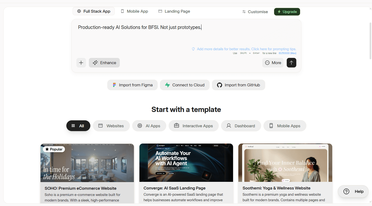 If you would rather start from a pre-built design, scroll down to the "Start with a template" section. Templates are organised into five categories ; Websites, AI Apps, Interactive Apps, Dashboard, and Mobile Apps. Pick one that matches your use case, and Dualite will use it as your starting point.