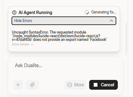 If Dualite detects a bug or error in your project, it surfaces a "Fix with AI" button automatically. You do not need to identify the problem or describe it just click the button and Dualite reads the error log, identifies the affected code, and applies a fix. If you want to give it more context for example, what you were trying to do when the error appeared you can type additional information in the chat before clicking Fix with AI.