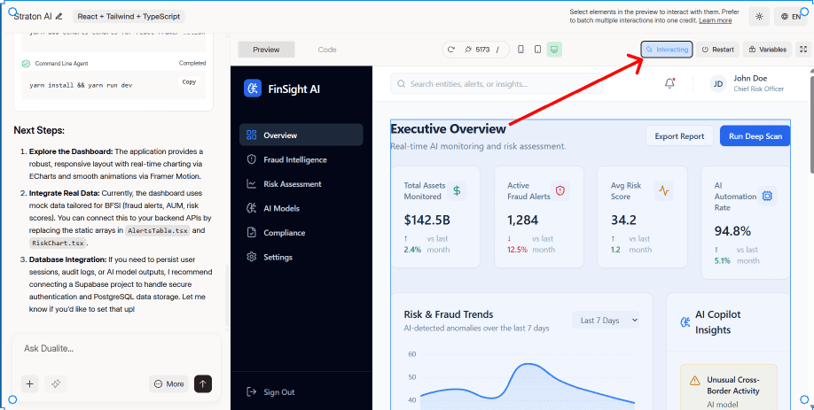 If you want to change something specific a button, a text block, a card without describing where it is in words, use Interaction Mode. Switch to the Preview tab, click the Interact button, and then click directly on the element you want to change. An instruction box appears over it type exactly what you want done, click Save, and a yellow pill appears in your chat bar carrying the element's full technical metadata alongside your instruction. When you send it, Dualite knows exactly what to change and where.