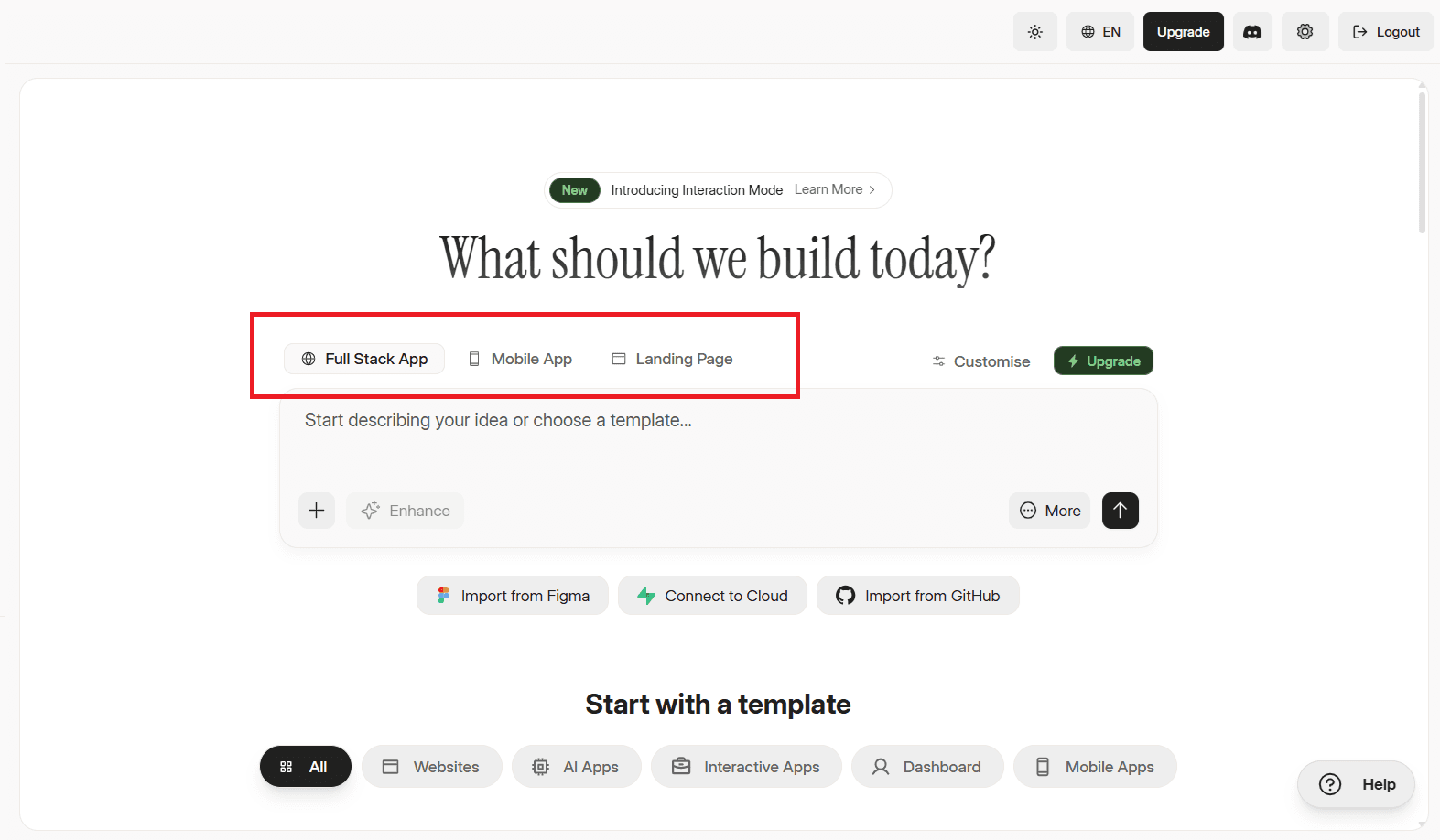 Before writing your prompt, select the type of app you want to build using the tabs just above the prompt bar. Dualite gives you three options ; Full Stack App, Mobile App, and Landing Page. Choosing the right type helps Dualite generate the correct structure and layout from the start.