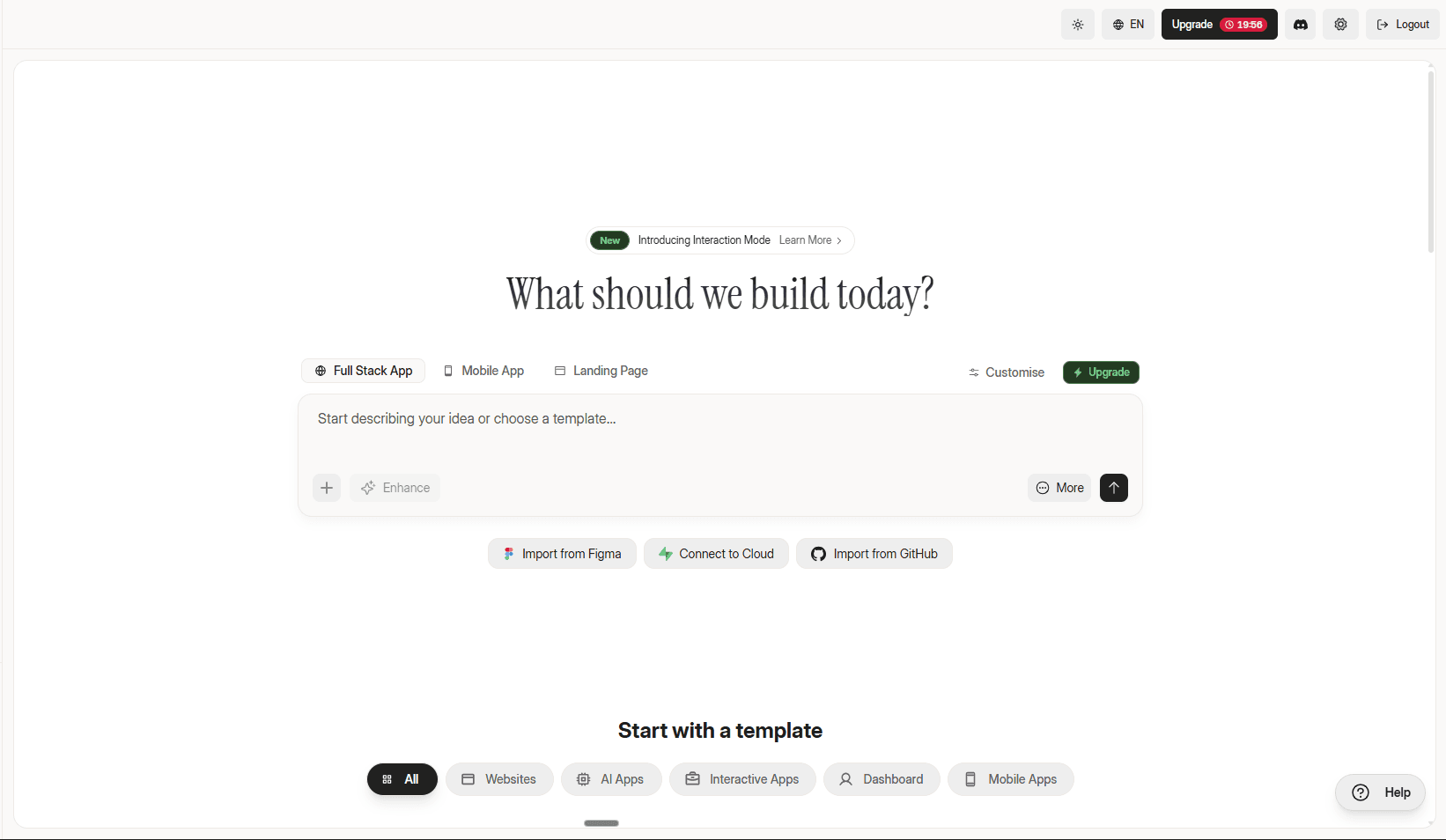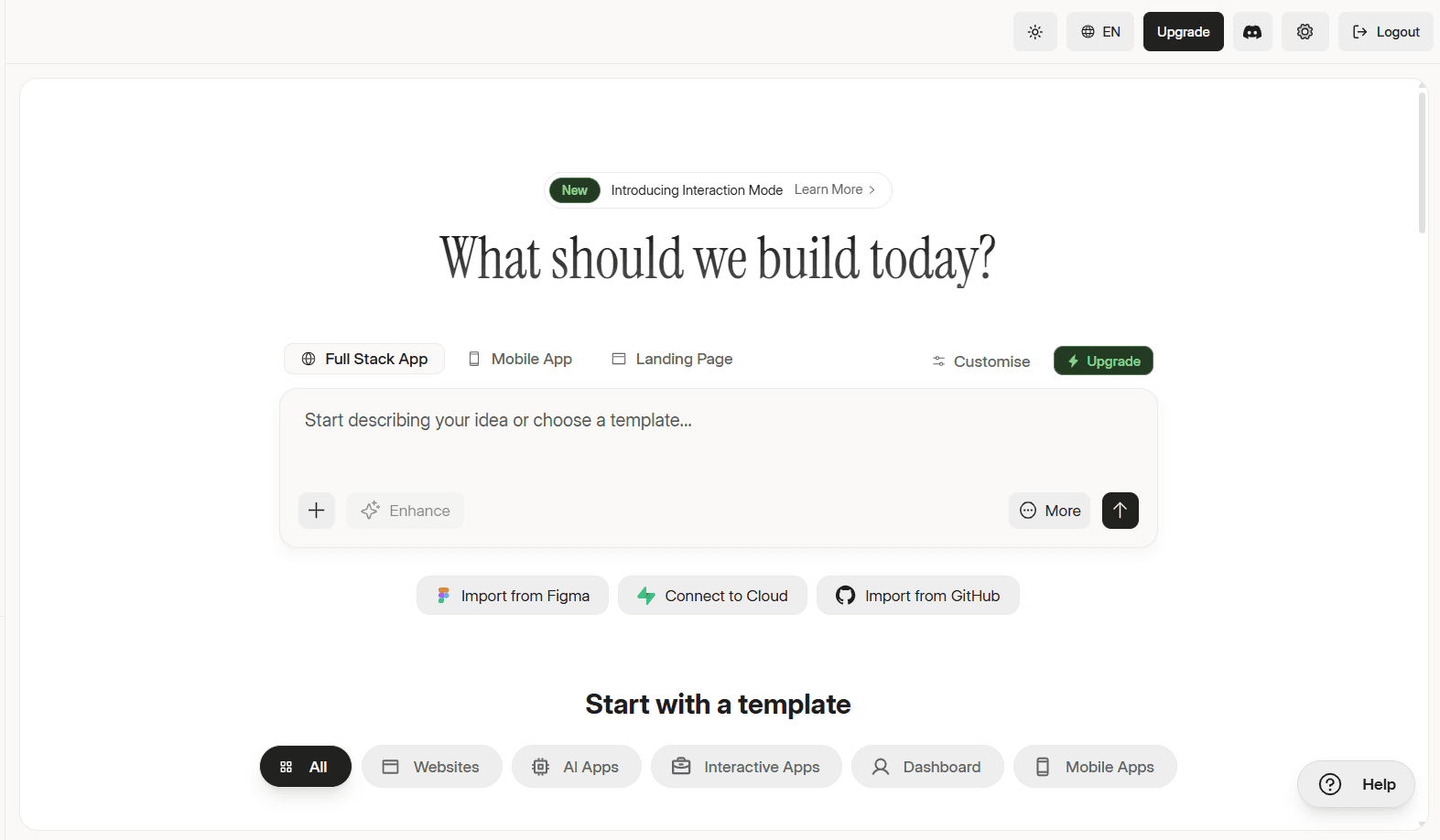 You can also start by importing an existing Figma design, connecting to GitHub to import an existing project, or connecting to cloud storage all three options are available as quick-start buttons directly below the prompt bar.
