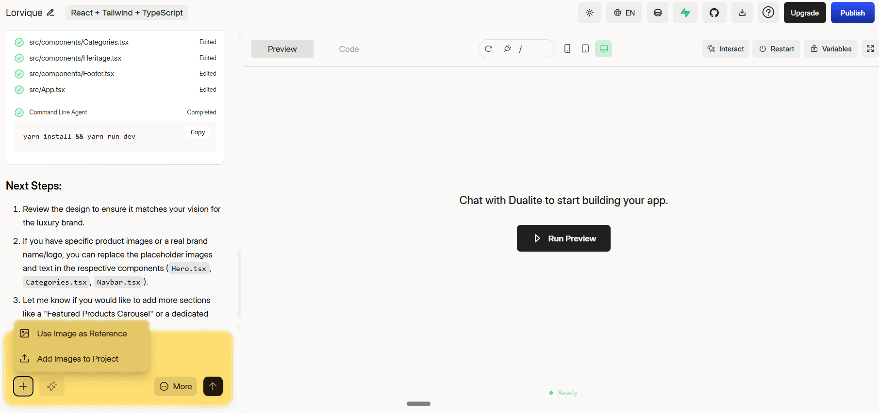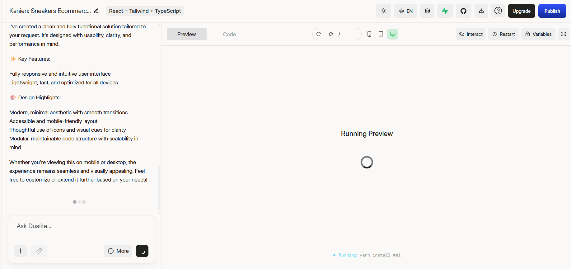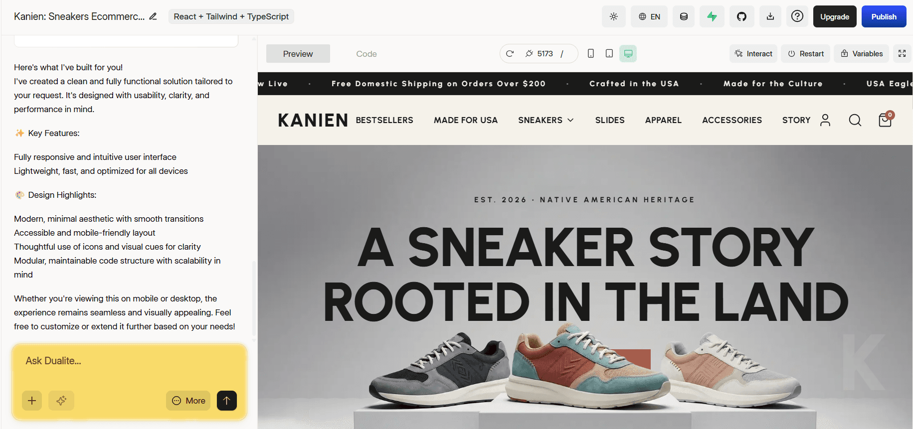 Once your assets are in, use the Ask Dualite... chat bar to refine specific sections. Not happy with how a product page looks? Describe the change. Want the collection grid adjusted? Tell it exactly what you need. Use Enhance to let Dualite suggest improvements automatically. Switch between Preview and Code tabs at any time to check how everything looks or dig into the code directly.