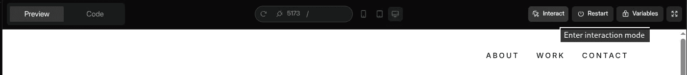 Navigate to the Preview Tab of your project and click the Interact button to enter Interaction Mode. As you move your mouse over the interface, you'll notice elements being highlighted with a blue overlay this indicates which element is currently targetable.