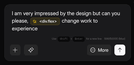 Type exactly what you want the AI to do for example, "Change this to a secondary ghost button style" or "Make this text wrap on mobile."
