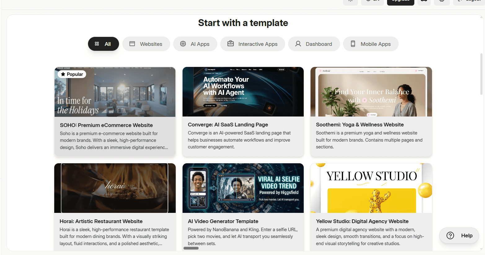 Scroll down from the prompt bar to the Start with a template section. You'll see a full library of templates organised by category: Websites, AI Apps, Interactive Apps, Dashboard, and Mobile Apps.