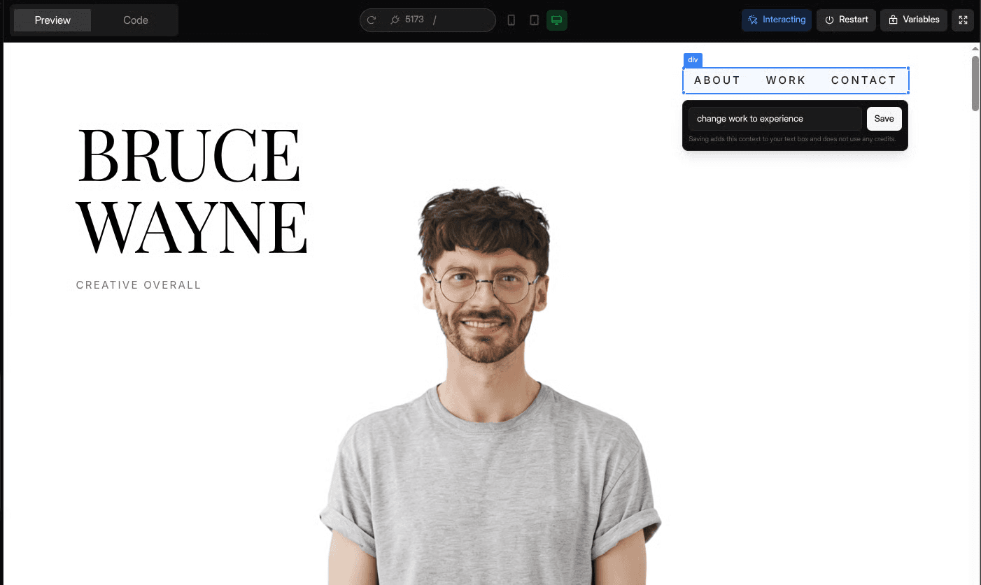 Instead of typing out where an element is, you click it. An instruction box appears right over the element. You type what you want done "change this to a ghost button" or "make this text wrap on mobile" and hit Save.